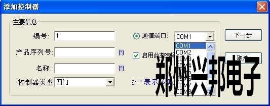 首先選擇好電腦的通訊端口,填寫產(chǎn)品的序列號(hào)一般出廠默認(rèn)設(shè)置是0000,然后為設(shè)備起個(gè)名稱,選擇好所控制門的類型,最后點(diǎn)擊下一步,接著會(huì)彈出如圖七所示對話框。