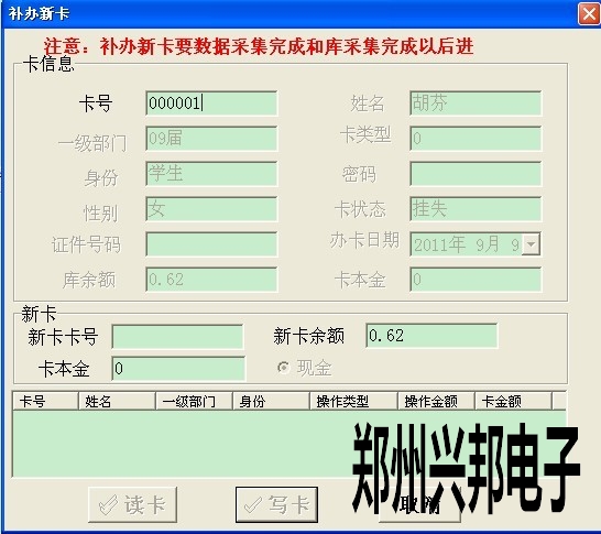 首先卡掛失(比如:卡號為000001),掛失后點卡管理-->補辦新卡,然后在卡號處輸入1,按回車鍵,此時會顯示出卡信息,如下圖所示