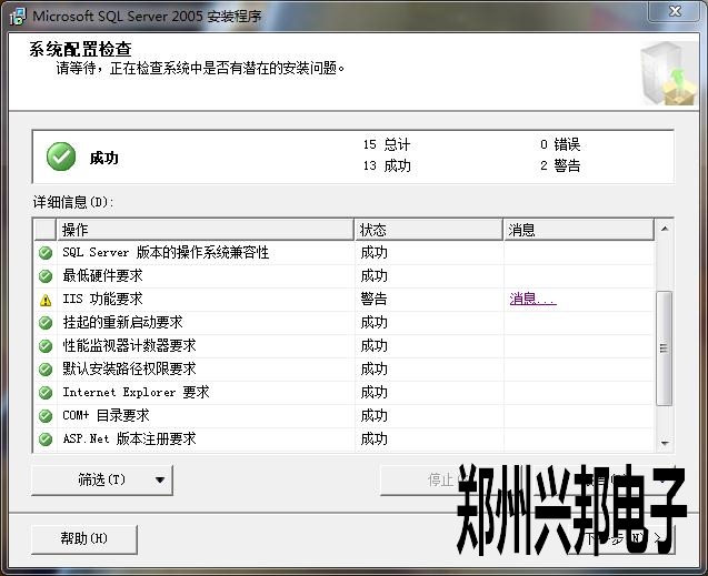 win7系統2005數據庫安裝時提示IIS功能要求是警告