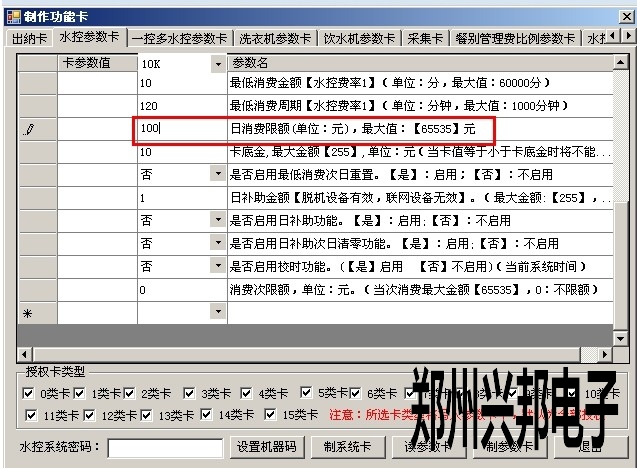 2)打開軟件 制卡中心-功能卡制作-水控參數卡中的日限額,輸入要設置的值,以元為單位,如下圖所示,代表100元,最大可設置到65535元,設置好后點擊制參數卡即可;