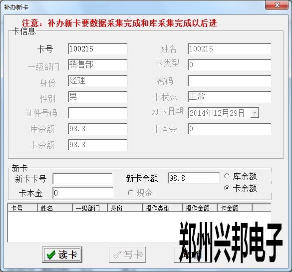 注: 收繳舊卡是卡片不再使用將卡片收回的操作,進(jìn)行讀卡,卡庫(kù)一致的情況下就可進(jìn)行寫卡,退還卡余額完成操作。收繳回來(lái)的卡可以重新發(fā)行。