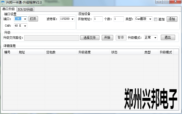 第三步:終端設(shè)備從應(yīng)用程序進(jìn)入升級界面后,關(guān)掉興邦在線升級工具后,重新打開興邦在線升級工具,并做以下配置:配置興邦在線升級工具中相應(yīng)的端口、波特率19200、開始地址設(shè)為1、個數(shù)項(xiàng)為1、類型選擇終端門禁一體機(jī)、升級模式選擇正常,點(diǎn)擊添加按鈕后、選擇相應(yīng)的文件,再點(diǎn)擊開始按鈕即可;直到升級完成。