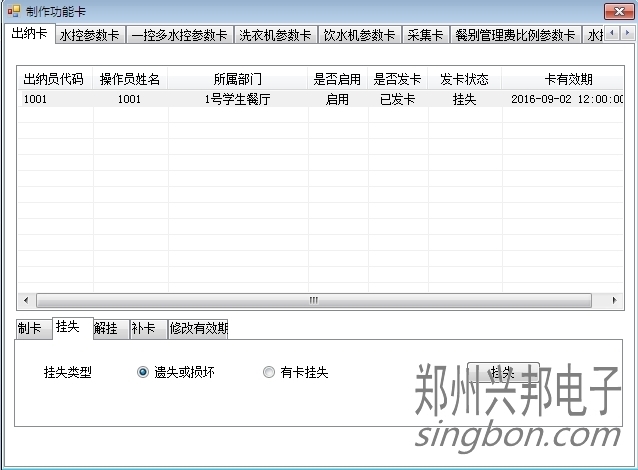 客戶使用的我們的互聯(lián)網(wǎng)一卡通食堂售飯機軟件,不小心把出納卡制成員工卡使用了,遇到這種情況,(1)用超級管理員身份登錄軟件,在軟件的制卡中心-功能卡制作-出納卡頁面里選中之前的出納員信息,選擇掛失(掛失類型選擇遺失或損壞),點擊右邊的掛失把原來的出納員賬號掛失;